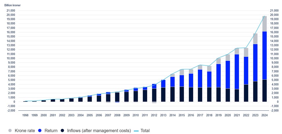 Norway did well economically but wasn’t a wealthy country until massive oil reserves were discovered in the 1960s. After building out the oil industry, in 1990, Norway decided to establish a sovereign wealth fund (a fancy term for the country’s investment fund), called the Norwegian Government Pension Fund Global (GPFG).