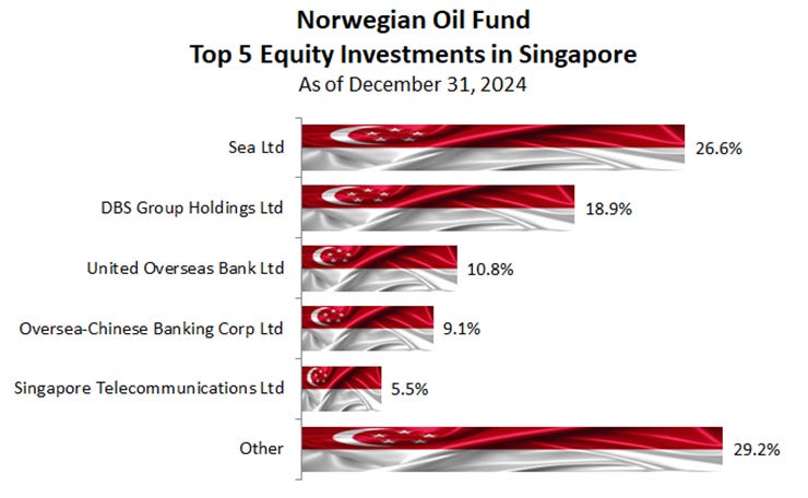 Similarly, if I wanted to invest in Singapore, I would probably either pick a country ETF or start with the top 5 Singaporean companies that the Norwegian Oil Fund invested in, namely Sea Ltd, DBS Group Holdings, United Overseas Bank, Oversea-Chinese Banking Corp, and Singapore Telecommunications.