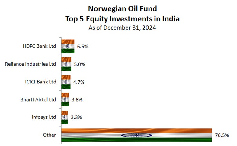 If I wanted to invest in India (and I am looking into it as the legendary investor Jim Rogers is very bullish on India), I would probably either pick a country ETF or start with the top 5 Indian companies that the Norwegian Oil Fund invested in, namely HDFC Bank, Reliance Industries, ICICI Bank, Bharti Airtel, and Infosys (see graph below).