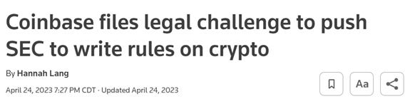 Source: https://www.reuters.com/legal/coinbase-files-legal-challenge-push-sec-write-rules-crypto-2023-04-25/
