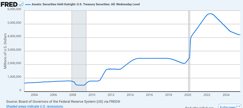 As of Q2 2025, the Fed holds about $4.2 Trillion worth of US Treasuries (about 14% of all US Treasuries excluding intragovernmental debt). That makes the Fed a critical buyer of US Treasuries.