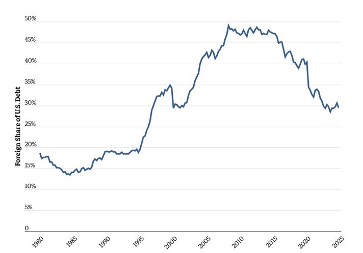 Source: https://bipartisanpolicy.org/blog/foreign-investors-hold-a-shrinking-share-of-u-s-debt/